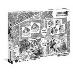 A dobozban egy 28 darabos dominó, 48 darabos memória játék és 2 darab 30 elemből álló kirakó kapott helyet. A kirakott képek mérete: 33 x 24 cm. A "Puzzle, dominó, memória játék - Disney hercegnők játékszett" nevű játék gyártója a Clementoni, főleg 4 és 12 éves kor közötti lányok számára ajánljuk.
